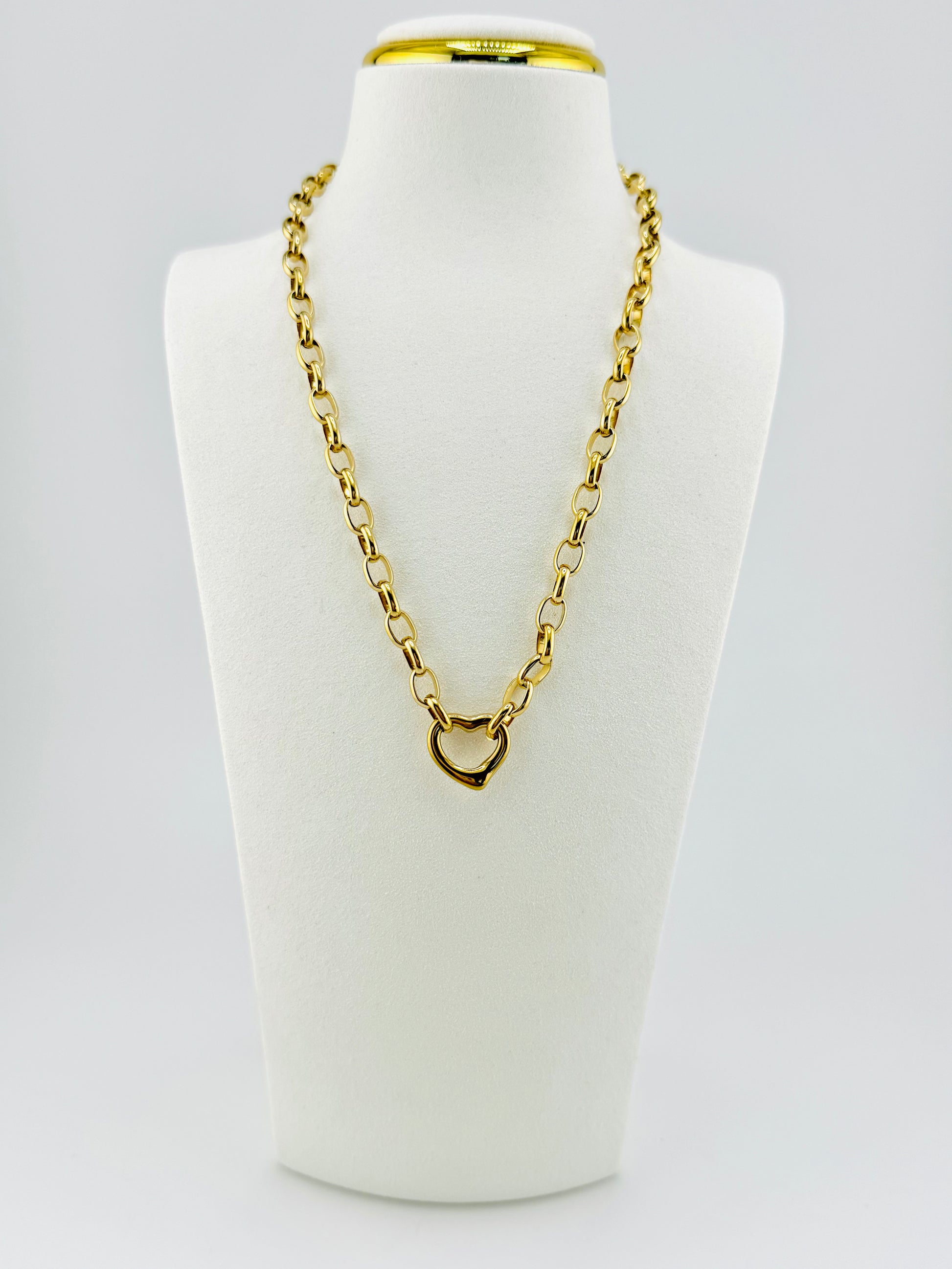 This heart-shaped 18k gold link necklace beautifully symbolizes love and faith. Crafted with care, its elegant design serves as a reminder of God's everlasting love and grace. Perfect for daily wear or special occasions, it offers a meaningful touch to your wardrobe, inspiring hope and devotion wherever you go.