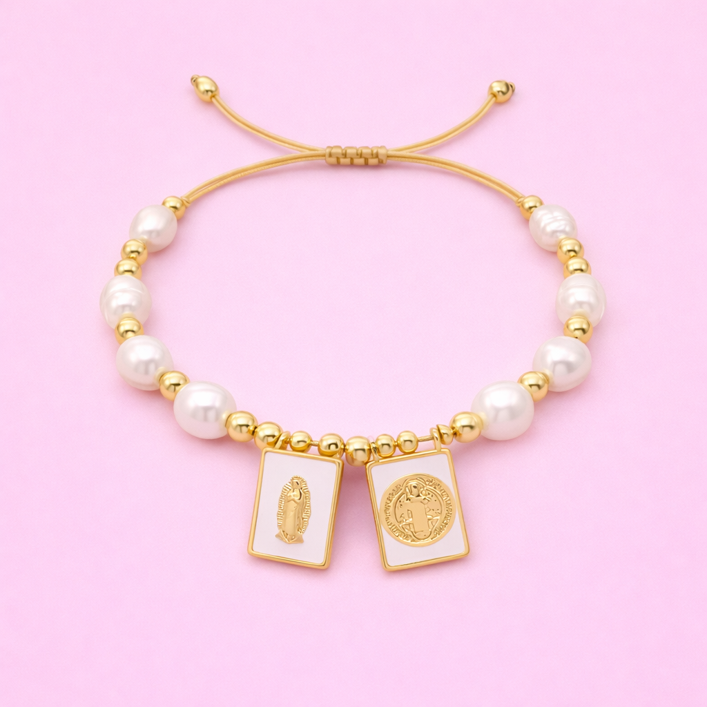 Kassidy Virgin of Guadalupe & St.Benedict with Real fresh water pearl & 18k gold filled adjustable bracelet